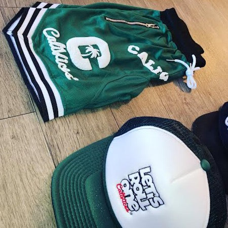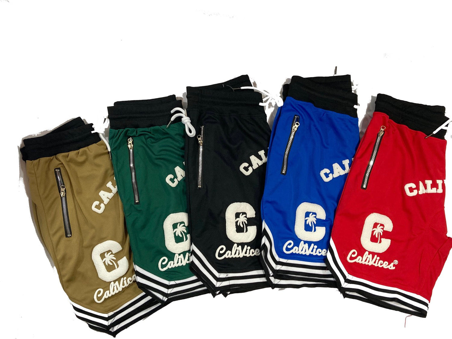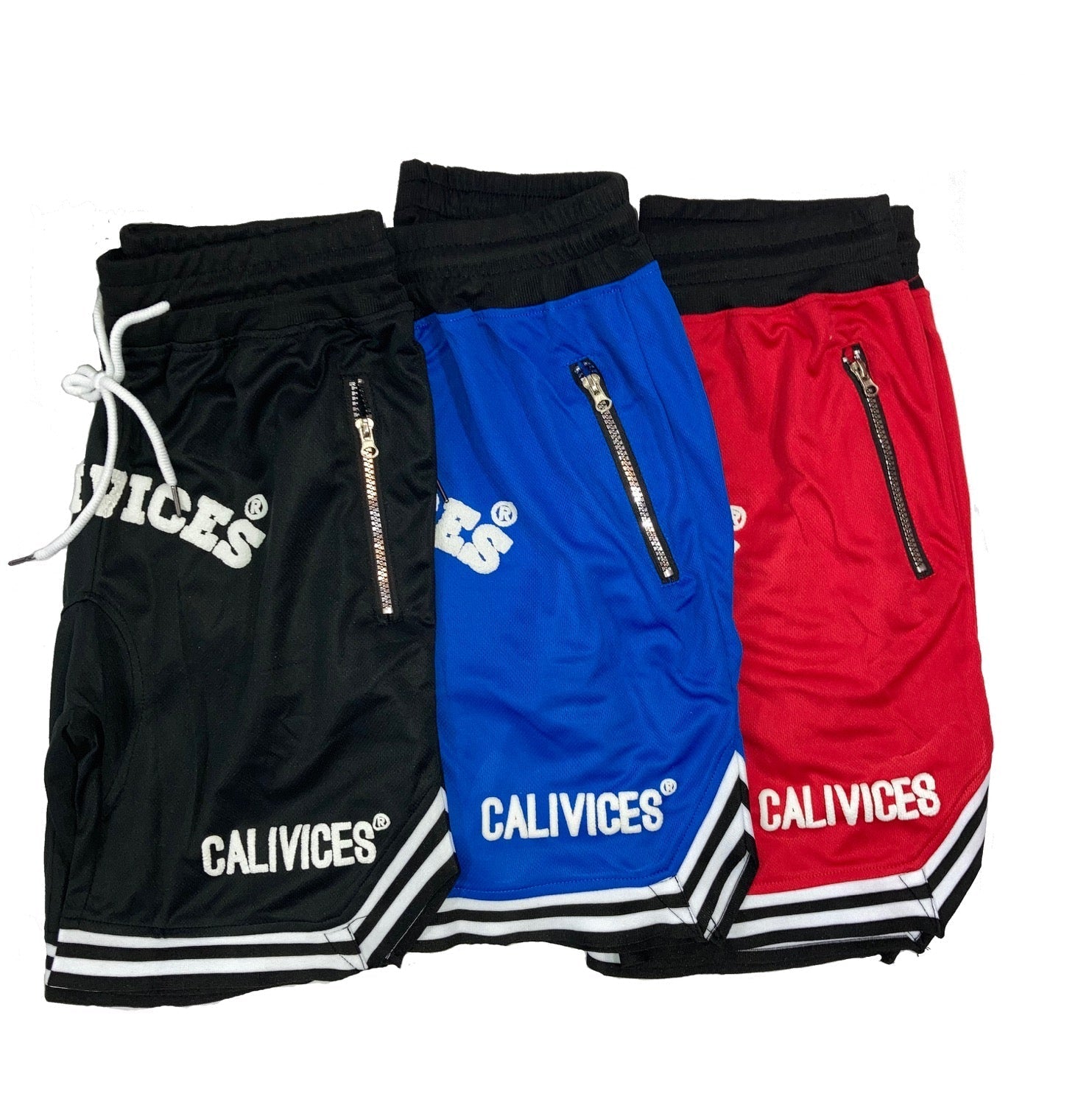 CaliVices multi logo fashion cut athletic unise shorts mesh available in 7 colors. Royal Blue, White, Red, Forrest Green, Yellow, Black, Tan