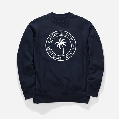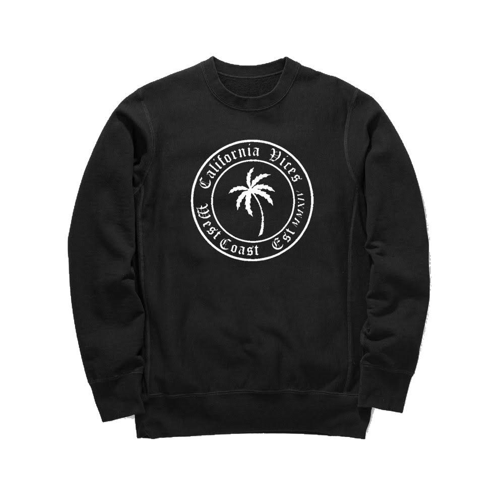 Relaxed fit crewneck sweatshirt with large contrast logo at chest. CaliVices Palm Tree Print Crewneck Sweater, warm light weight in multiple colors