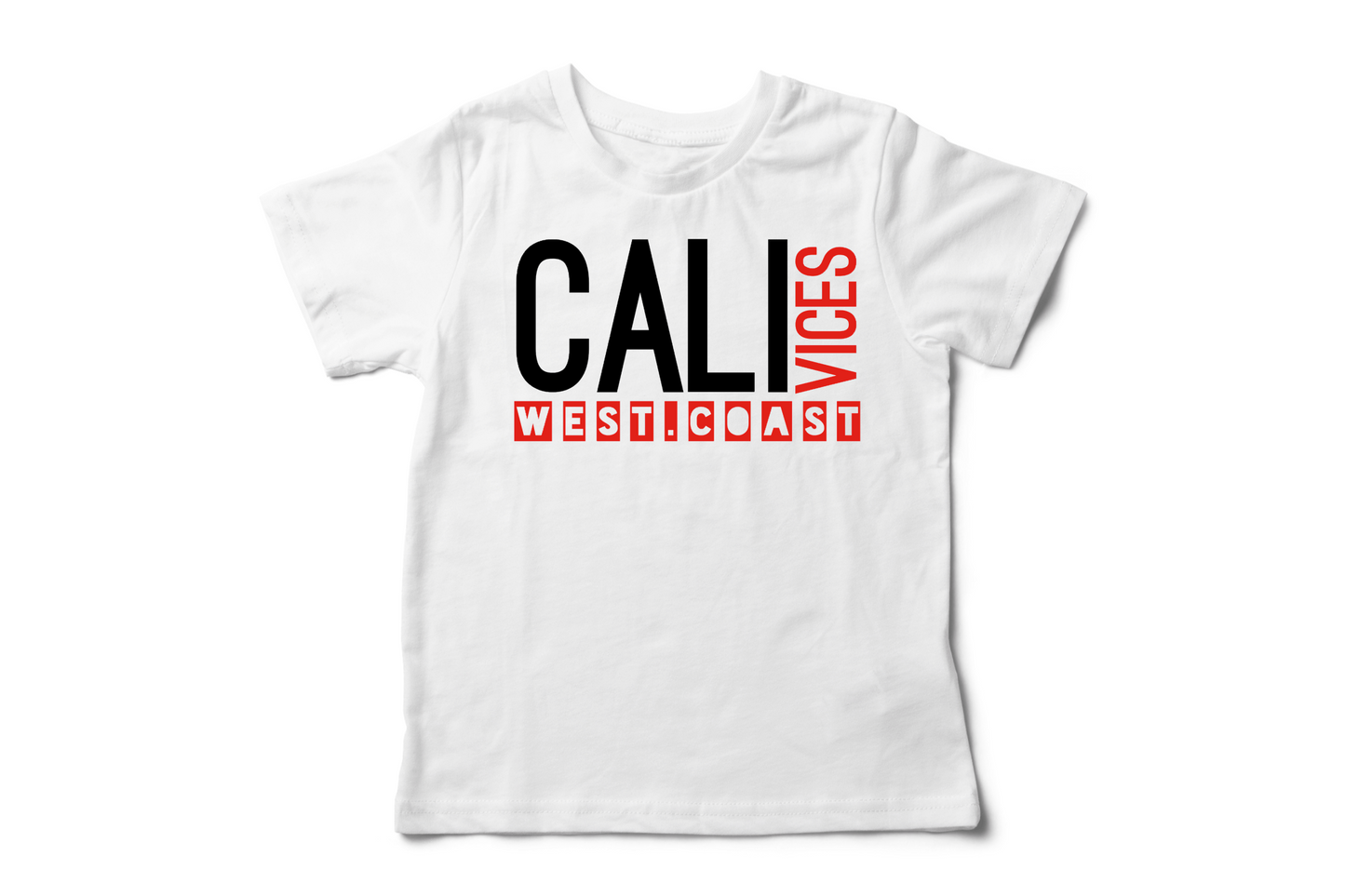 On my west coast s***t CaliVices block letter unisex tee shirt in 100% cotton and hand screen printed in white with black and red print.